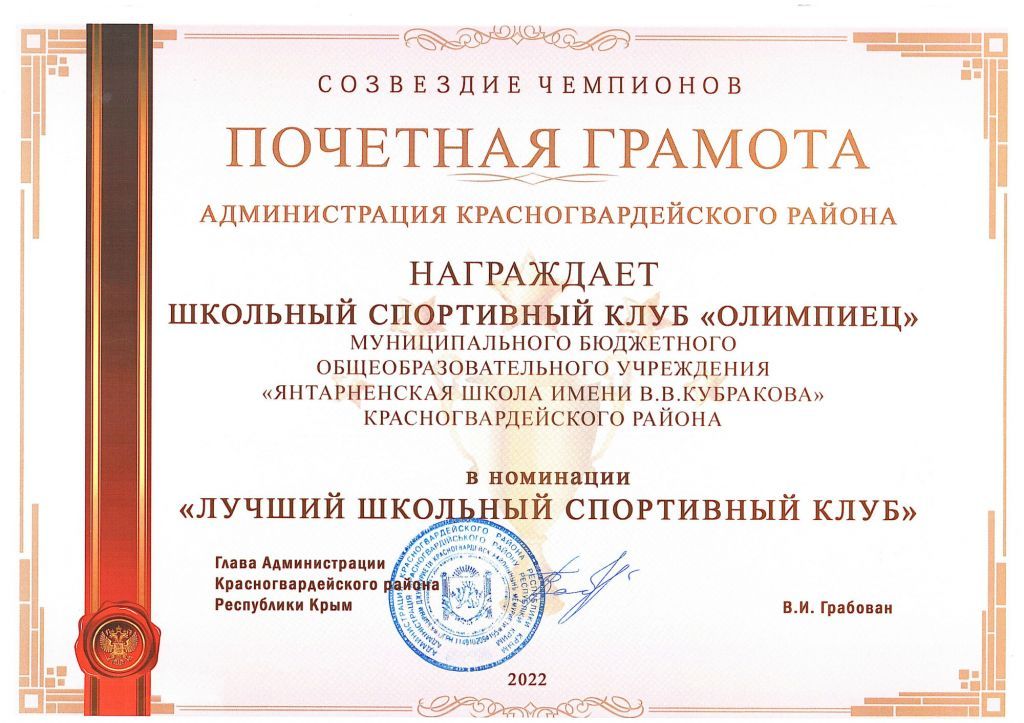 Работа школьного спортивного клуба получила высокую оценку со стороны Администрации Красногвардейского района – Школьный спортивный клуб «Олимпиец» награжден почетной грамотой в номинации «Лучший школьный спортивный клуб»